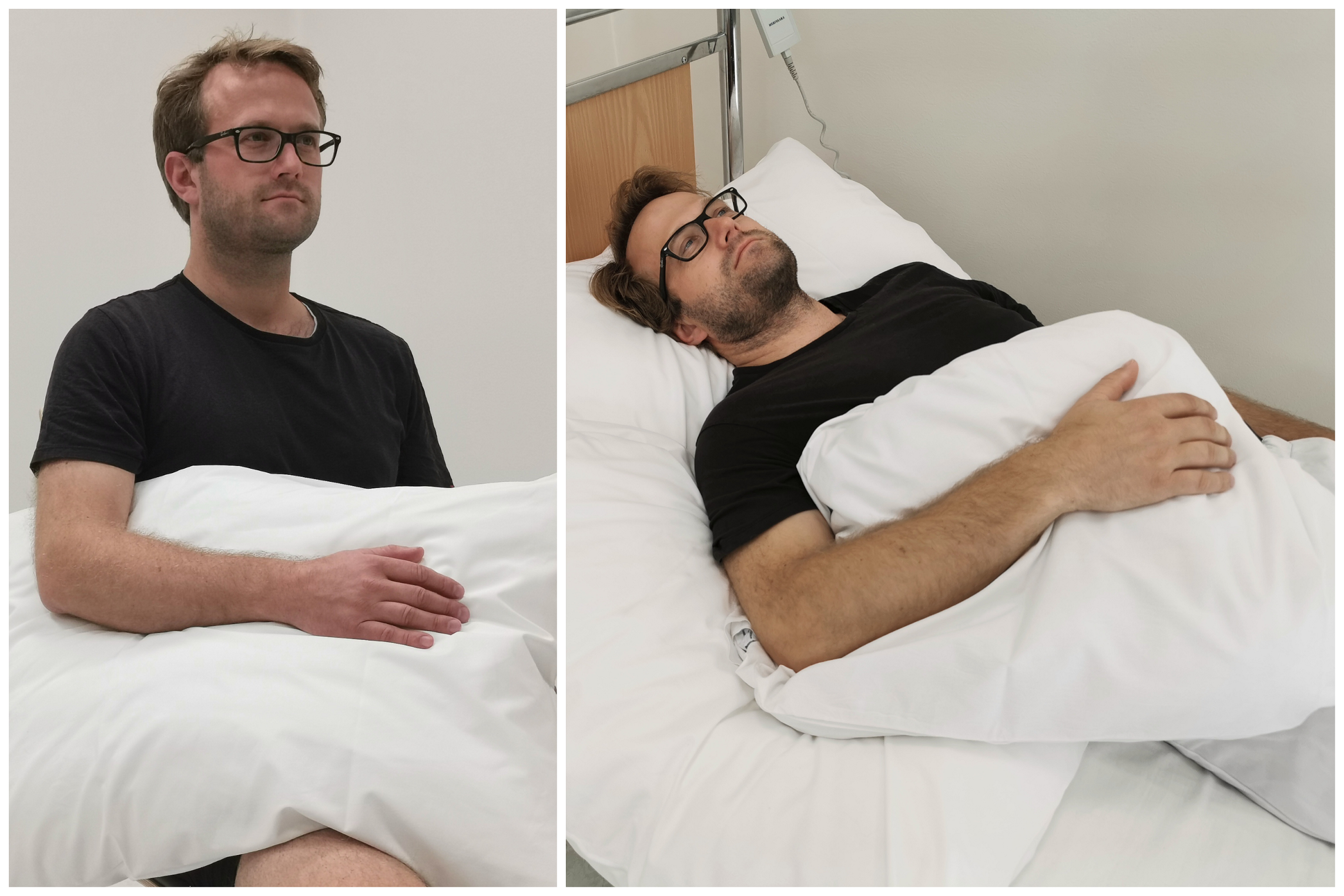 Når du er våken, kan du gjerne hvile uten at du har fatlen på deg. Når du ligger, kan du legge puter under og bak armen, samt under underarm og hånd. Du skal kjenne at du får lagt fra deg armen og slappet av i kroppen. Armen kan være bøyd, som vist på bildet, men du kan også fint ligge med armen strak.